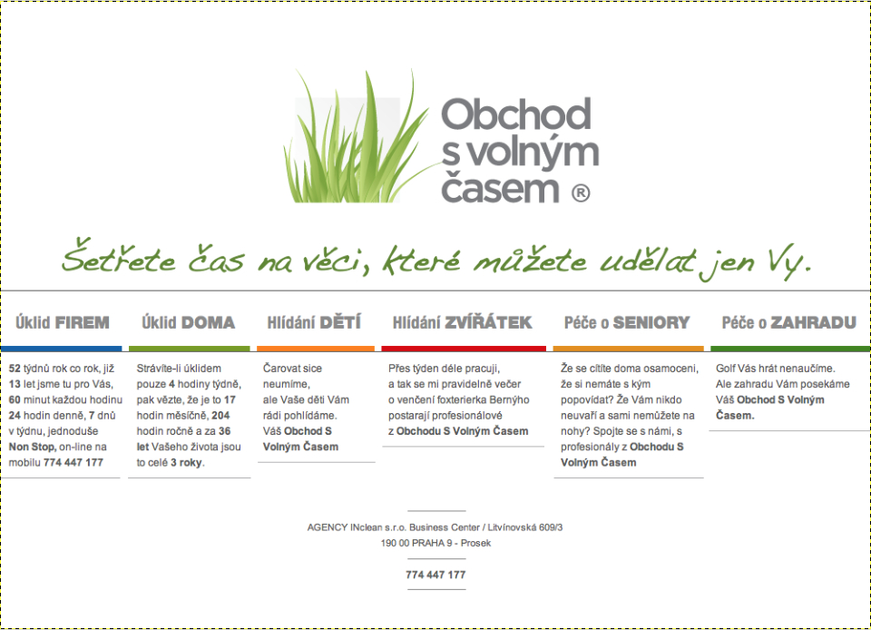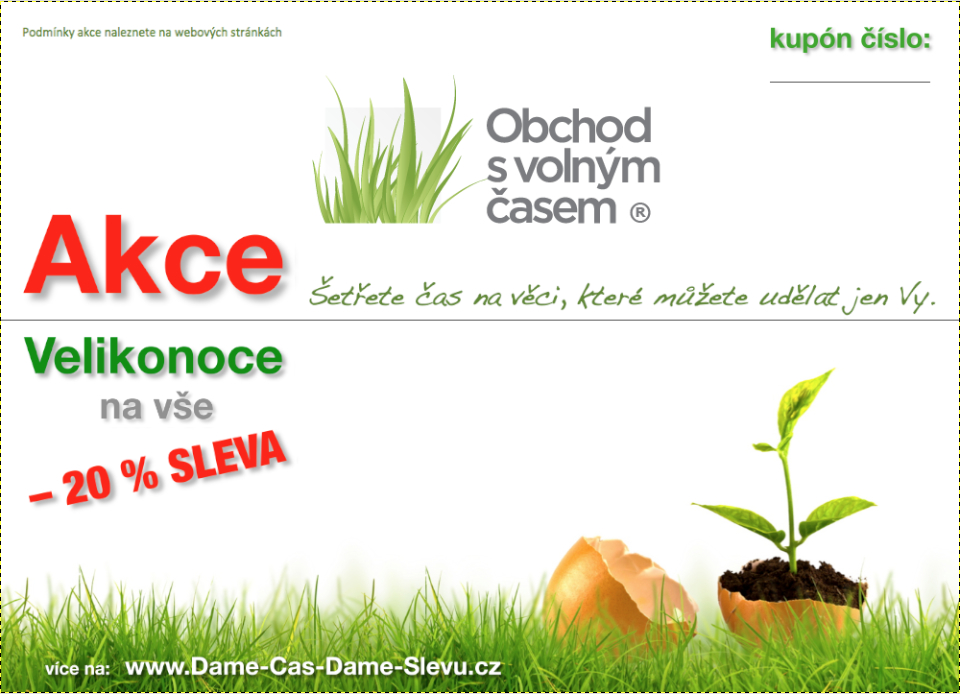 Organizátorem této slevové akce „Akce Velikonoce na vše - 20 % SLEVA“ je společnost AGENCY INclean s.r.o., majitel značky " Obchod S Volným Časem ", se sídlem na adrese PRAHA 2 - Vinohrady, Máchova 21/431, zapsaná v obchodním rejstříku u Městského soudu v PRAZE, oddíl C, vložka 82963 (dále jen „organizátor“). Adresa pro doručování je adresa kanceláře PRAHA 9 - Prosek, Litvínovská 609/3, mob. tel.:.: 774 447 177, www.Dame-Cas-Dame-Slevu.cz